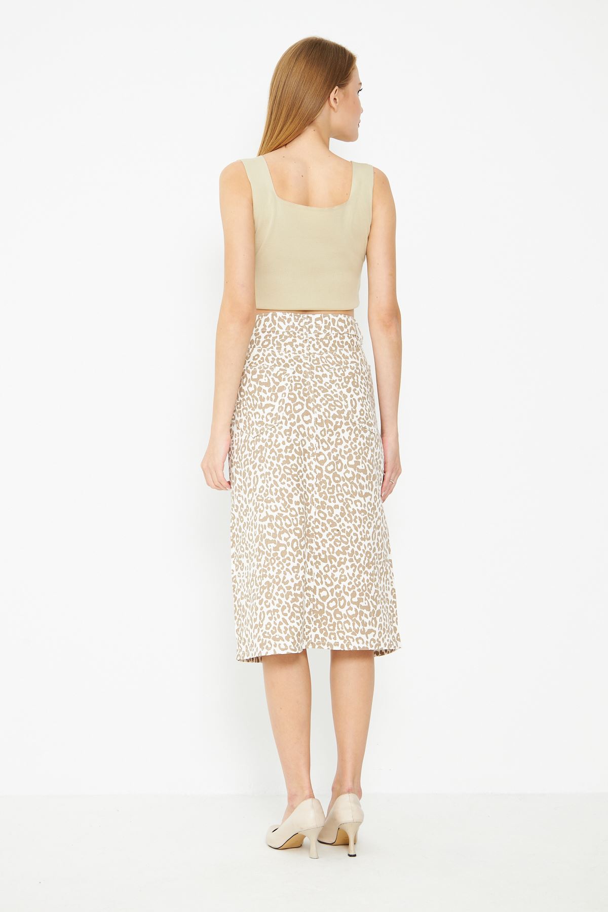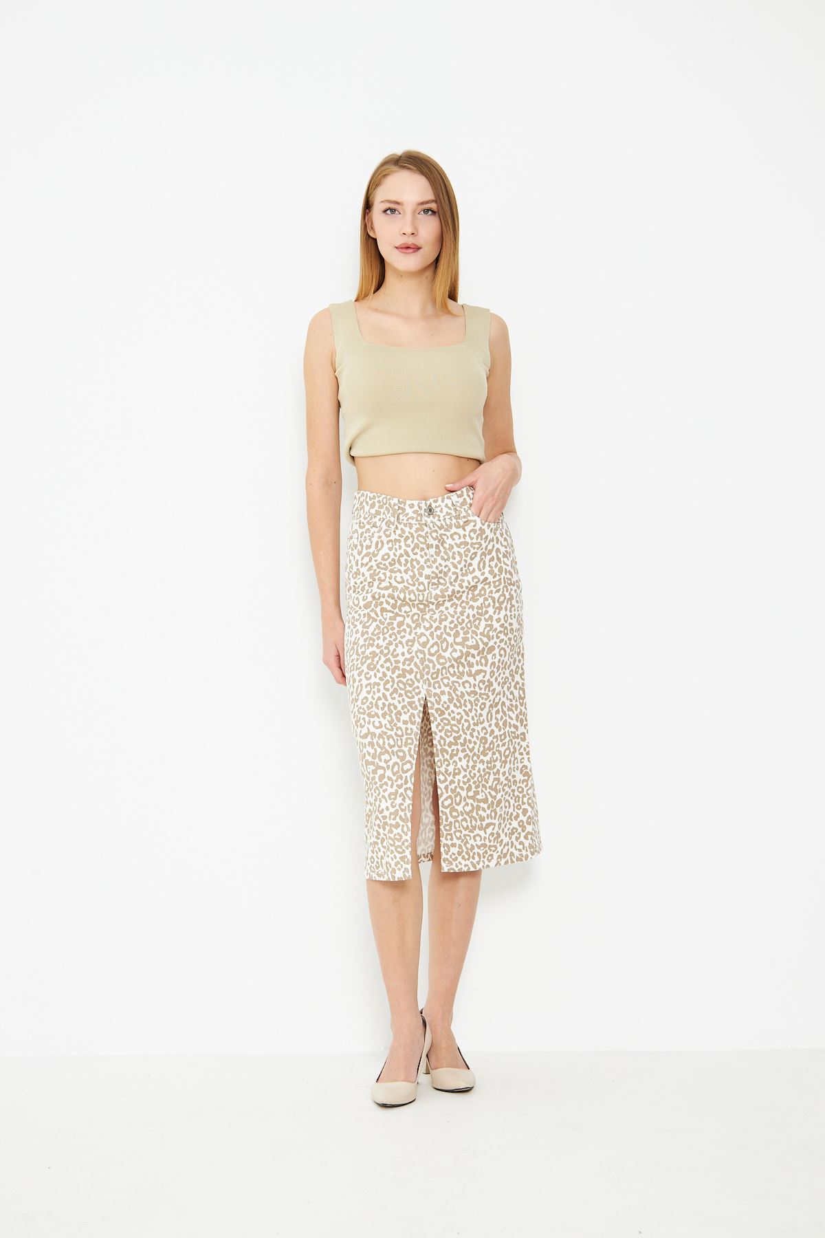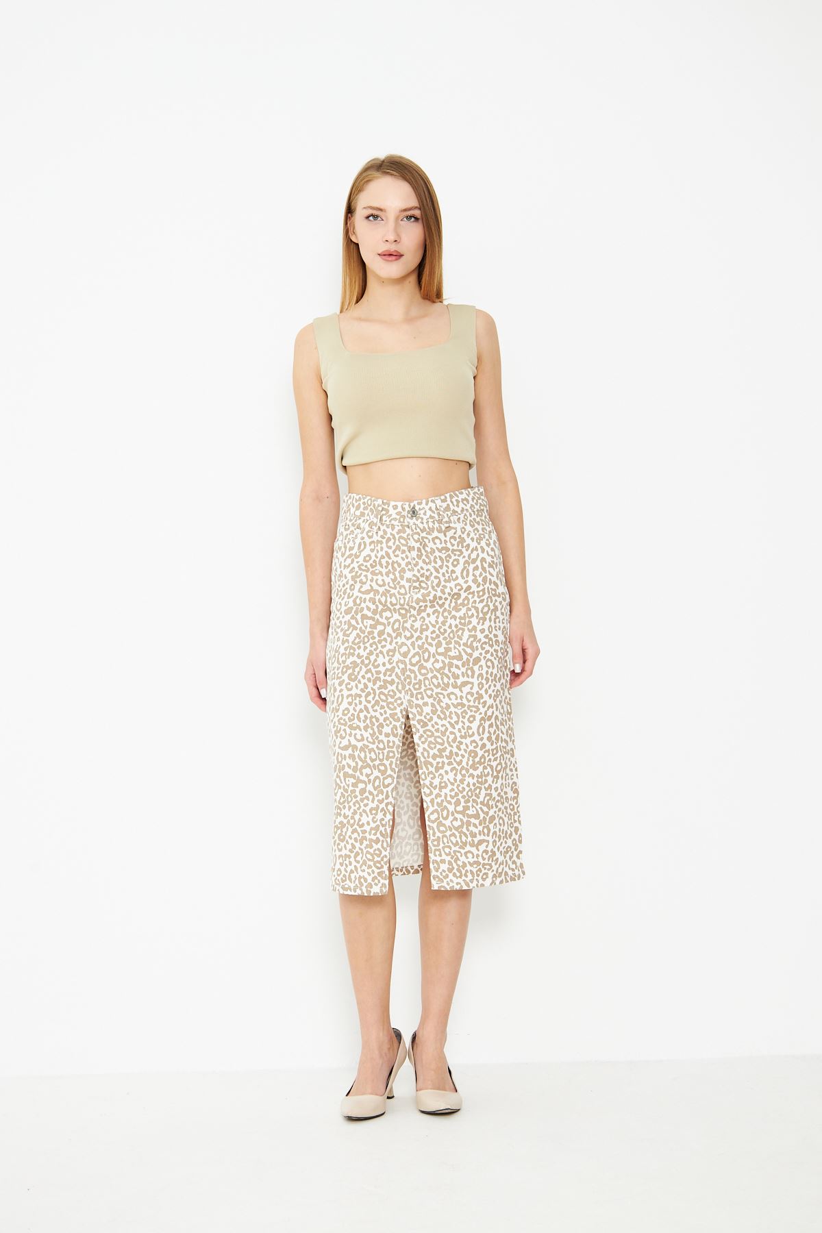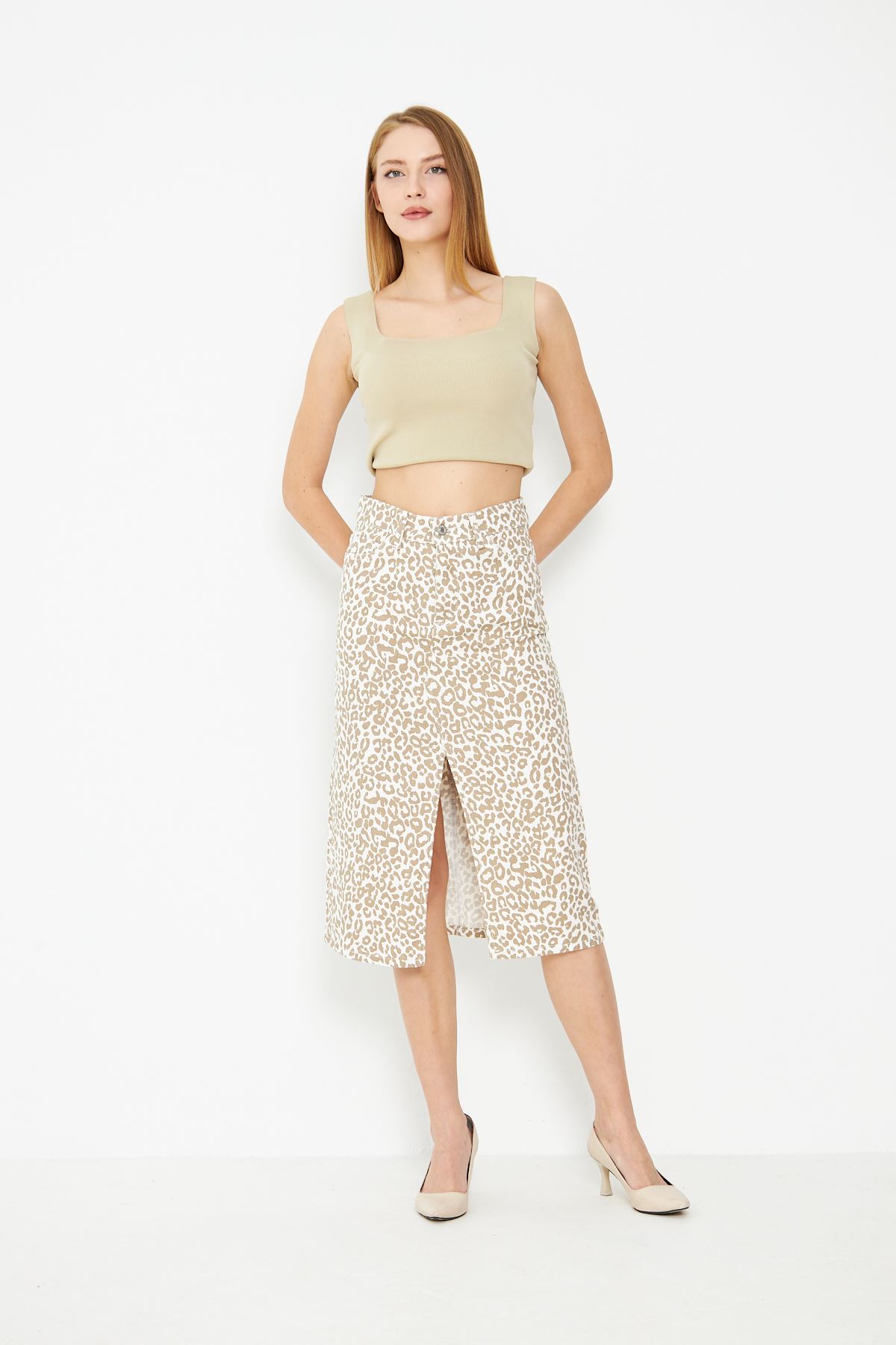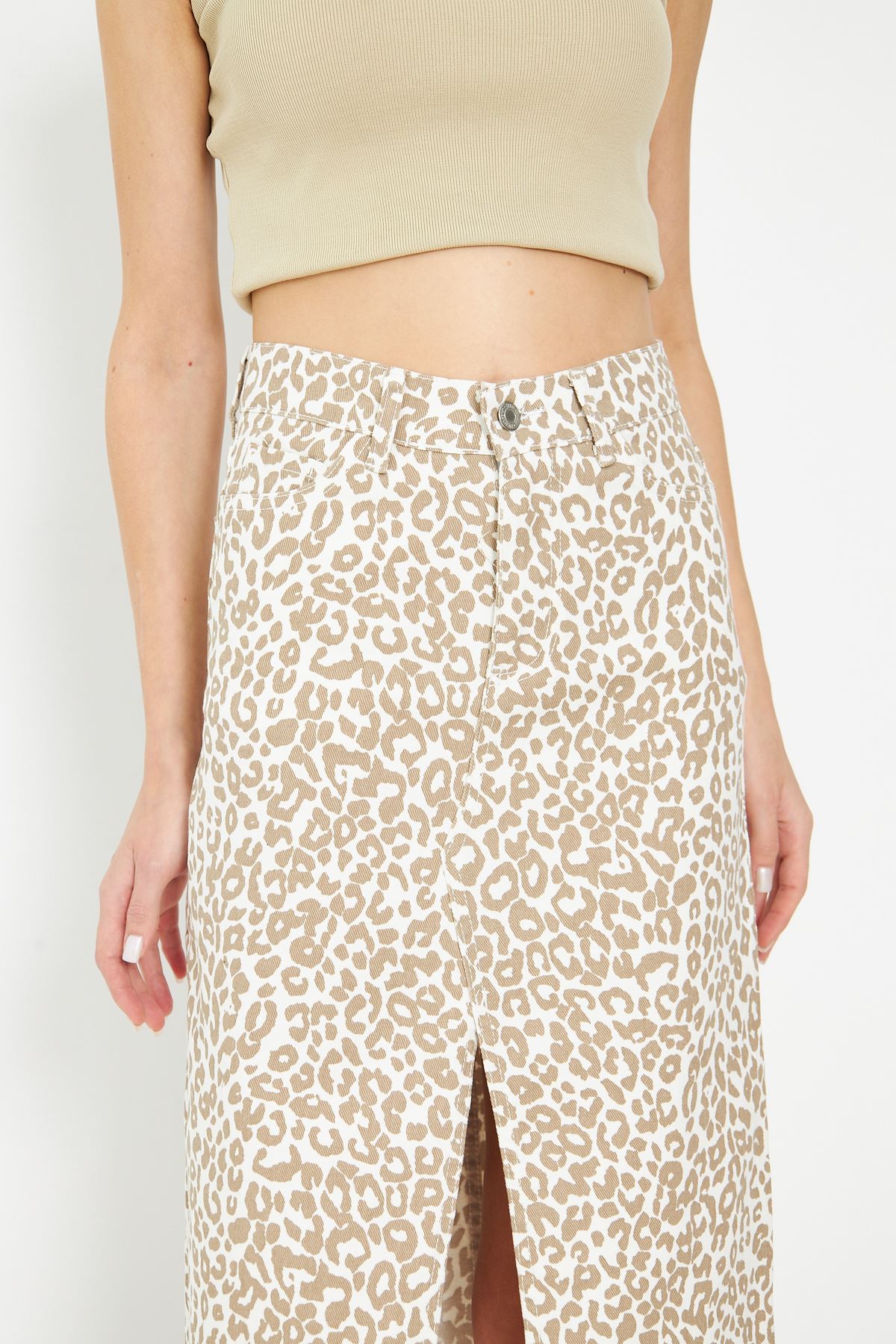 Leopar Desenli Yırtmaçlı Kot Etek BEJ