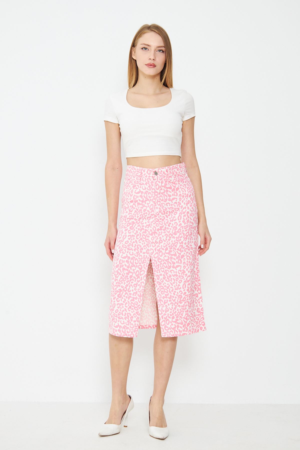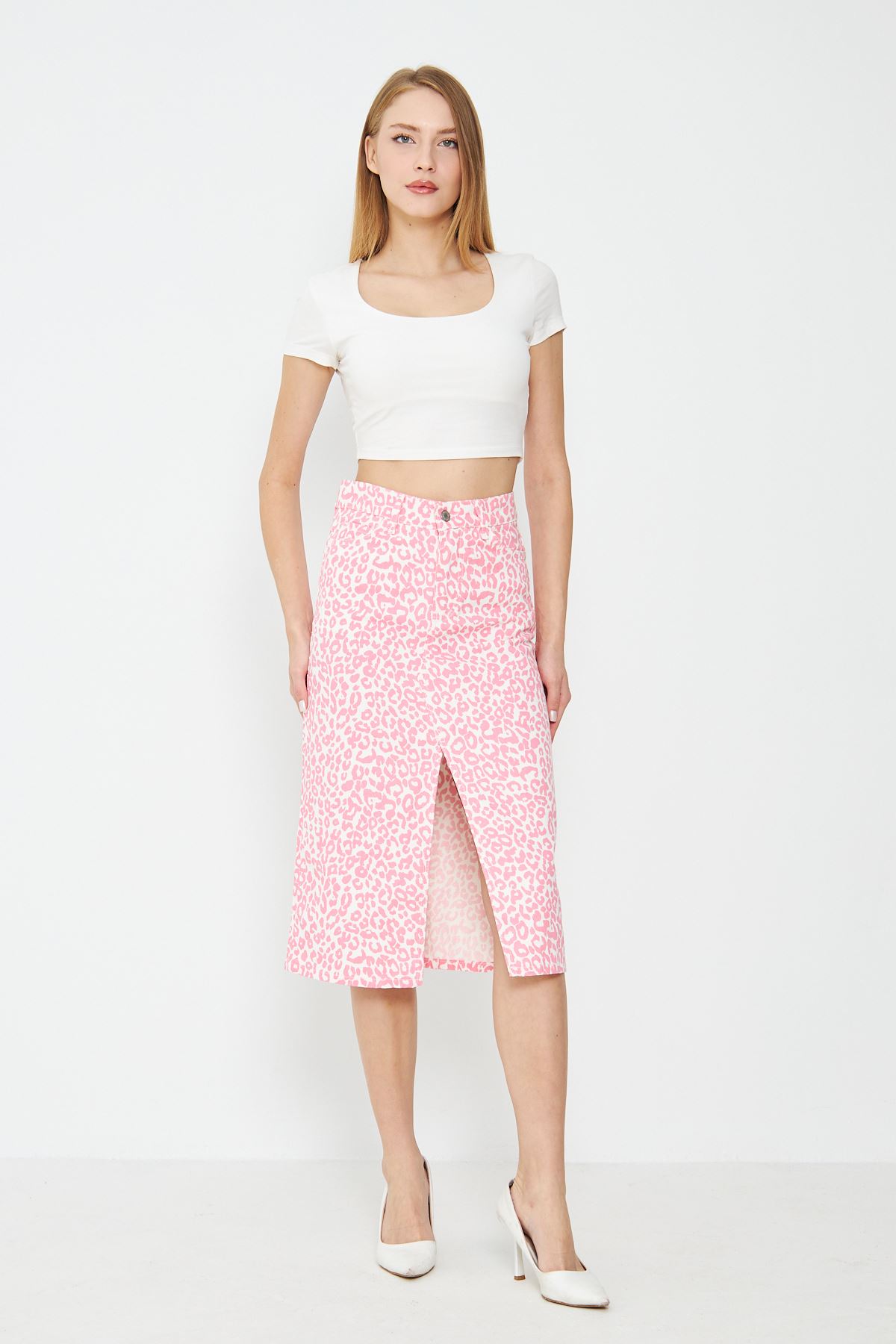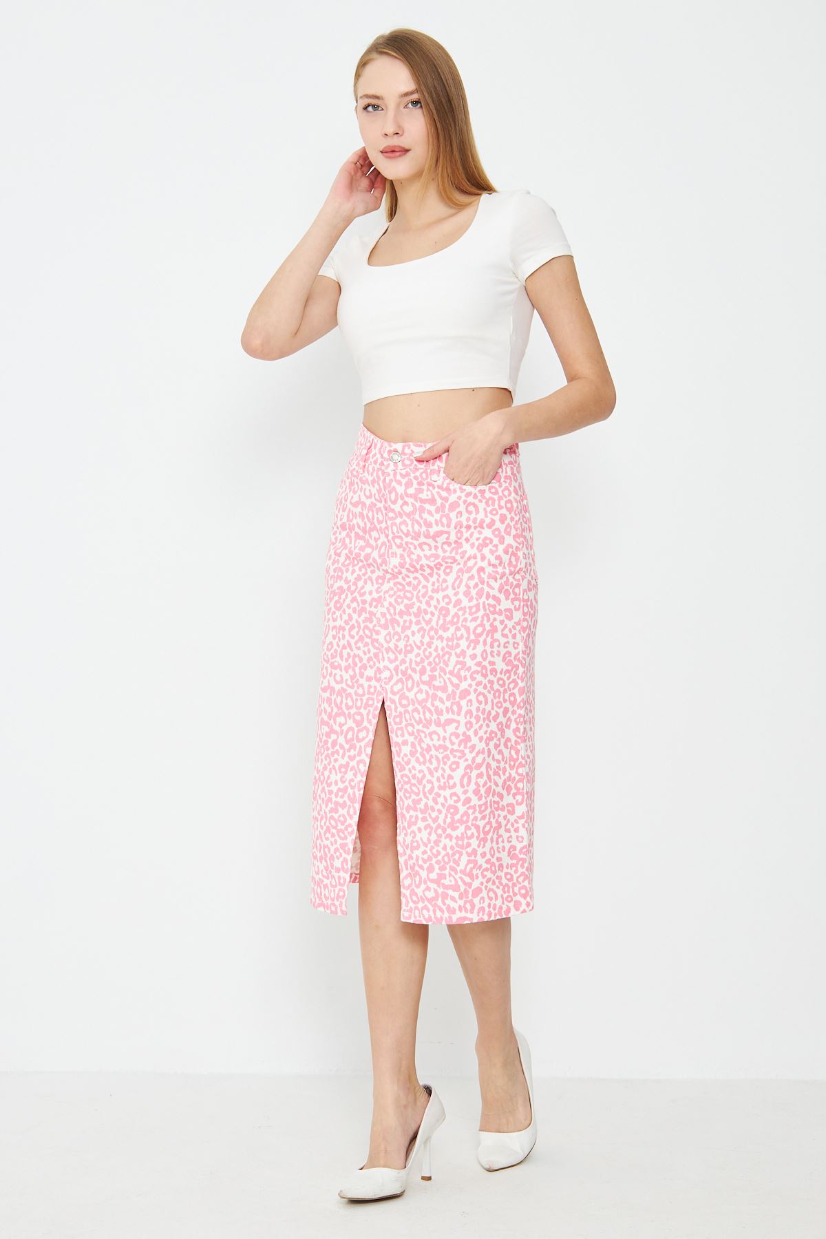 Leopar Desenli Yırtmaçlı Kot Etek PEMBE