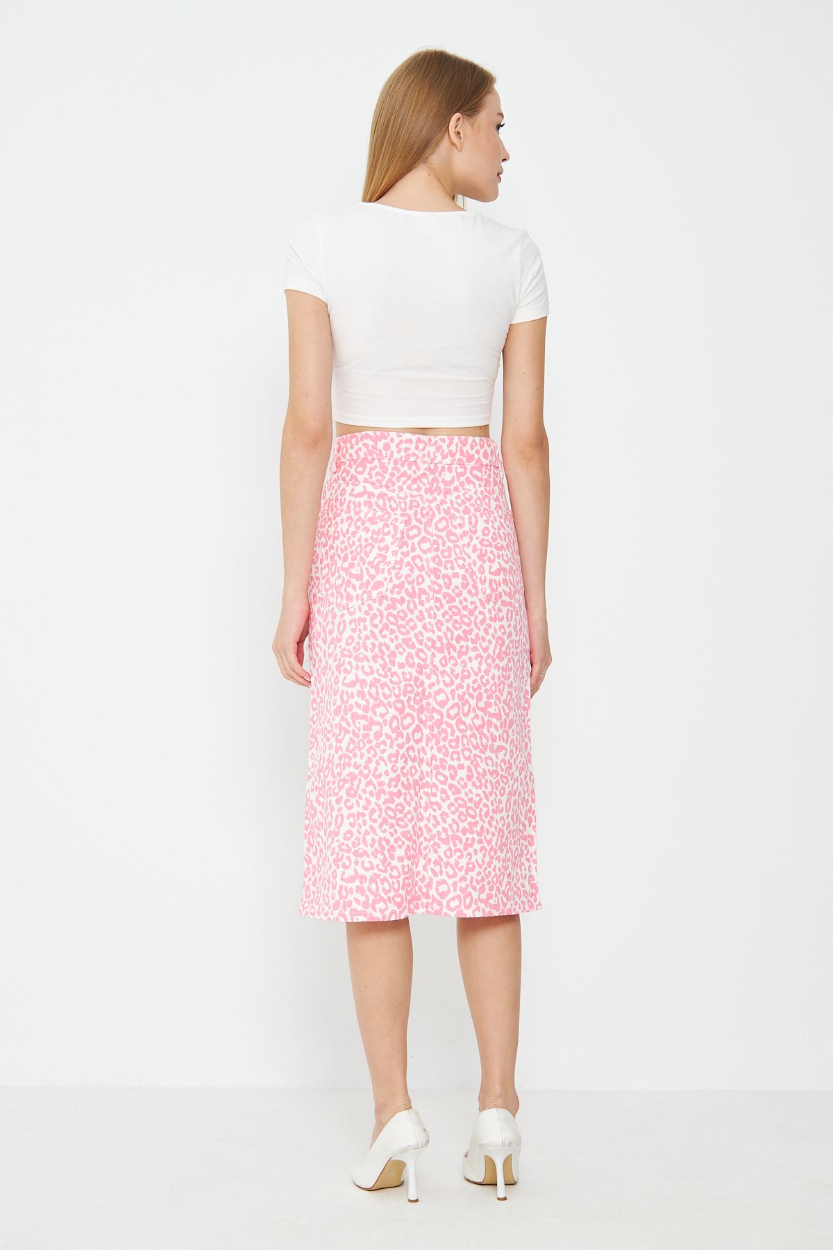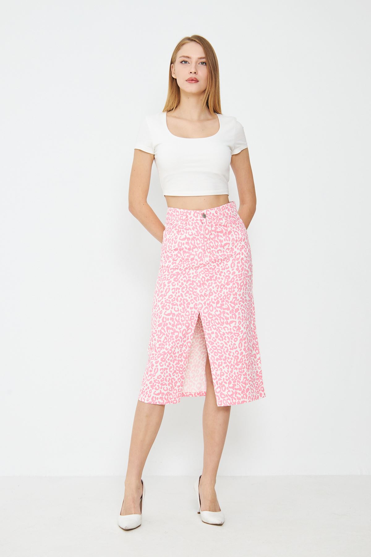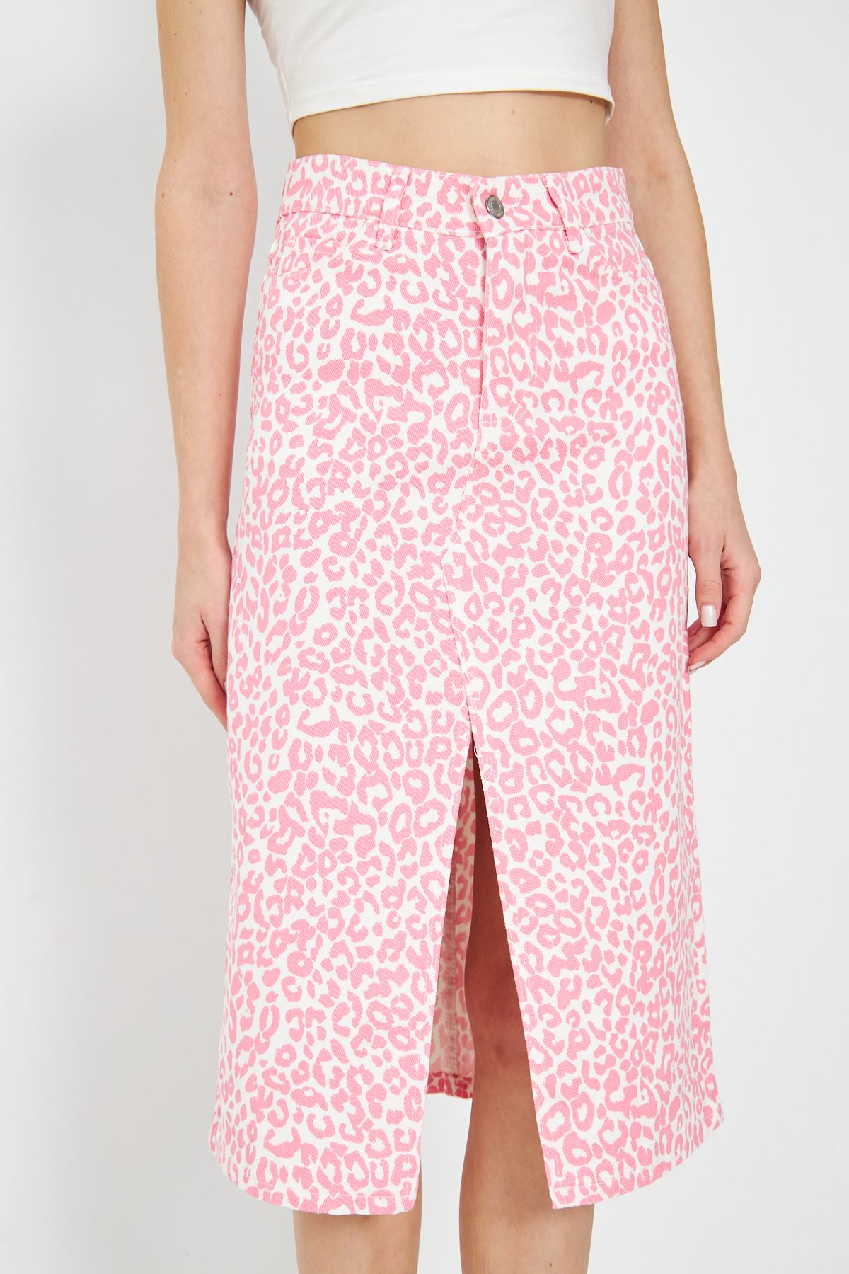 Leopar Desenli Yırtmaçlı Kot Etek PEMBE