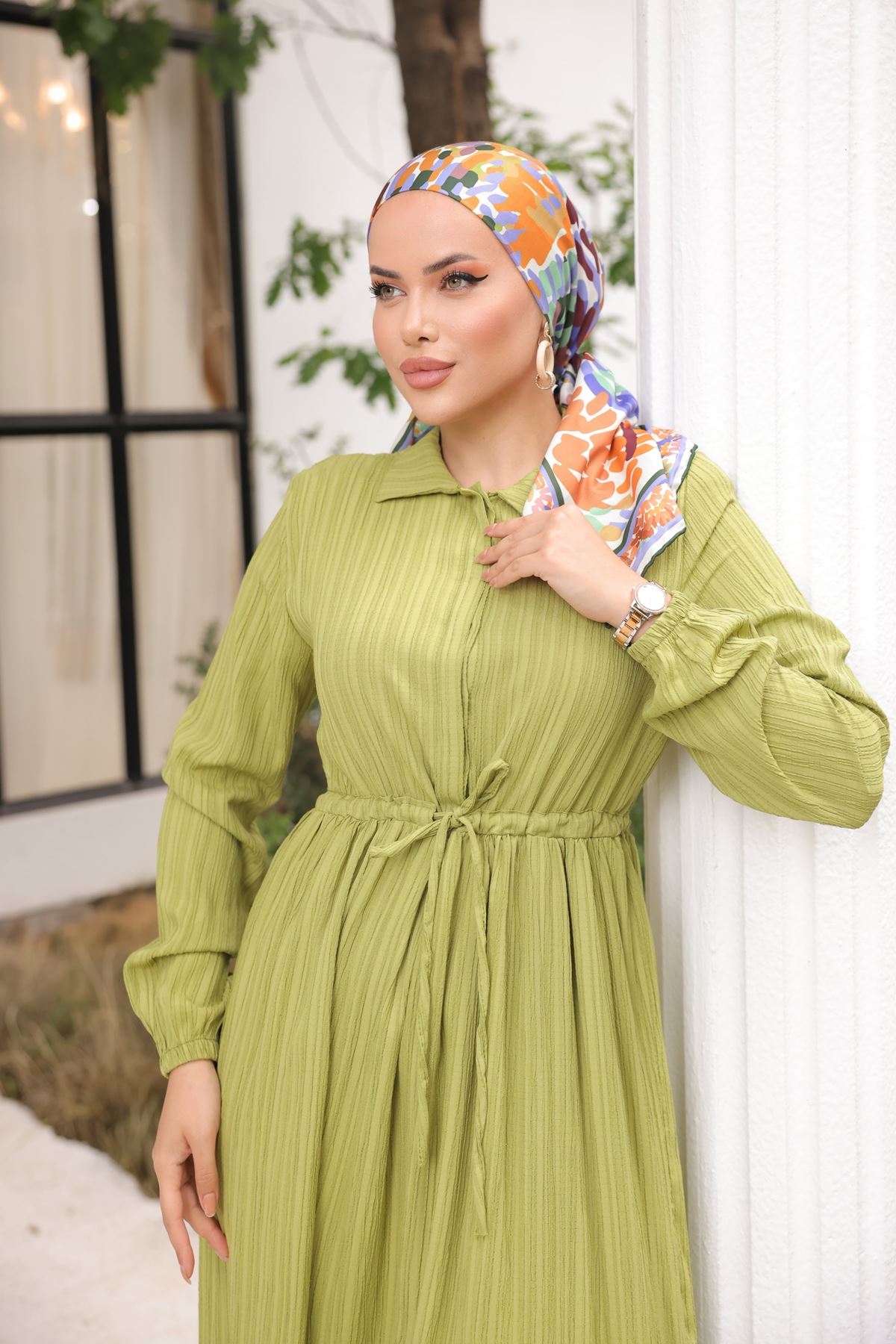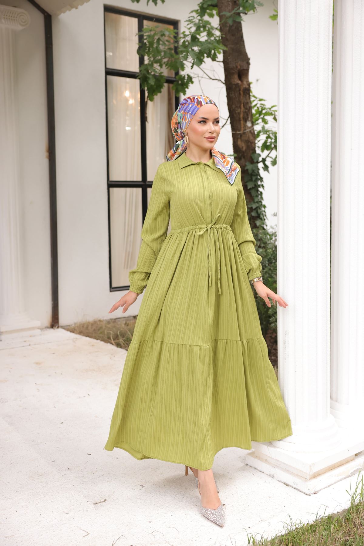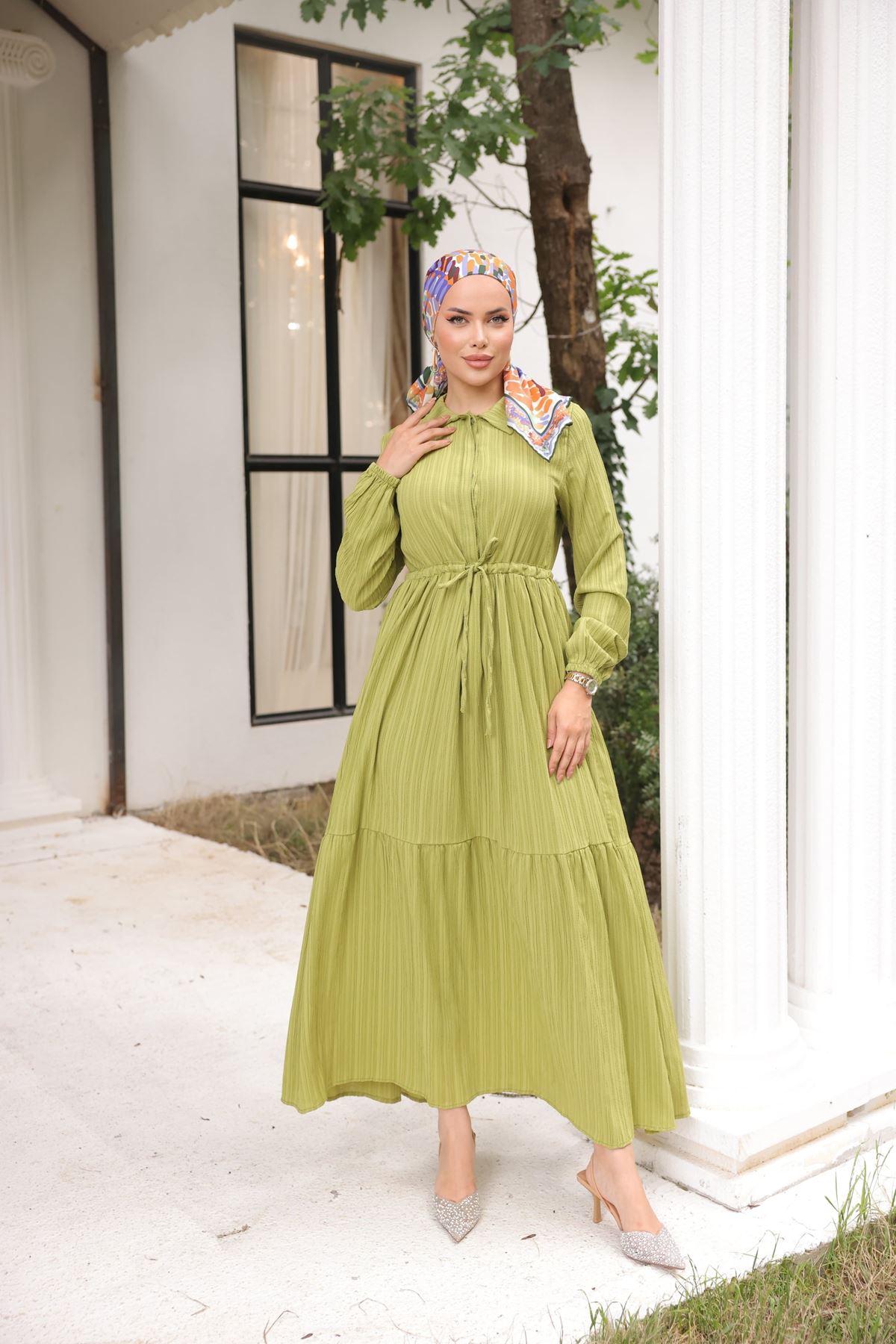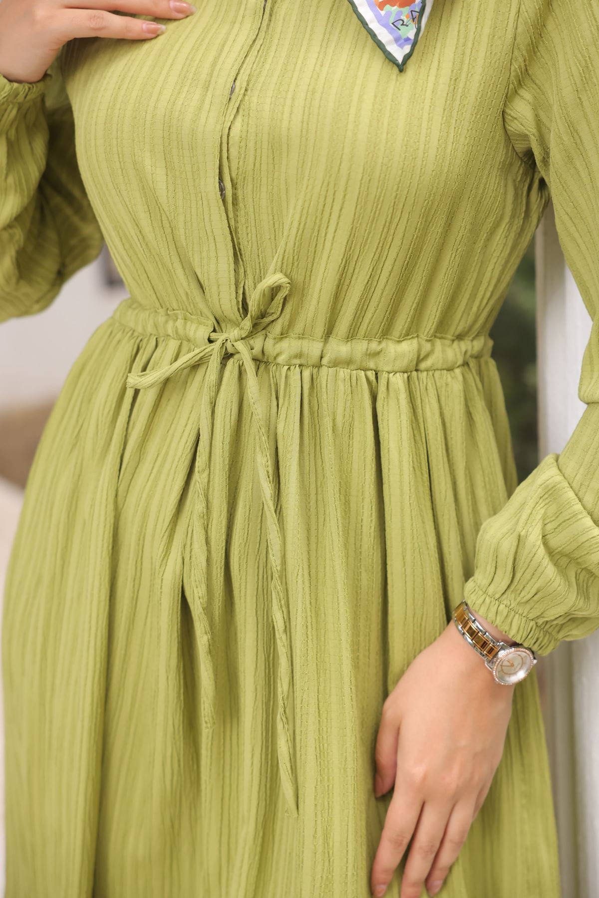 Maya Kumaş Beli Büzgülü Elbise FISTIK YEŞİLİ