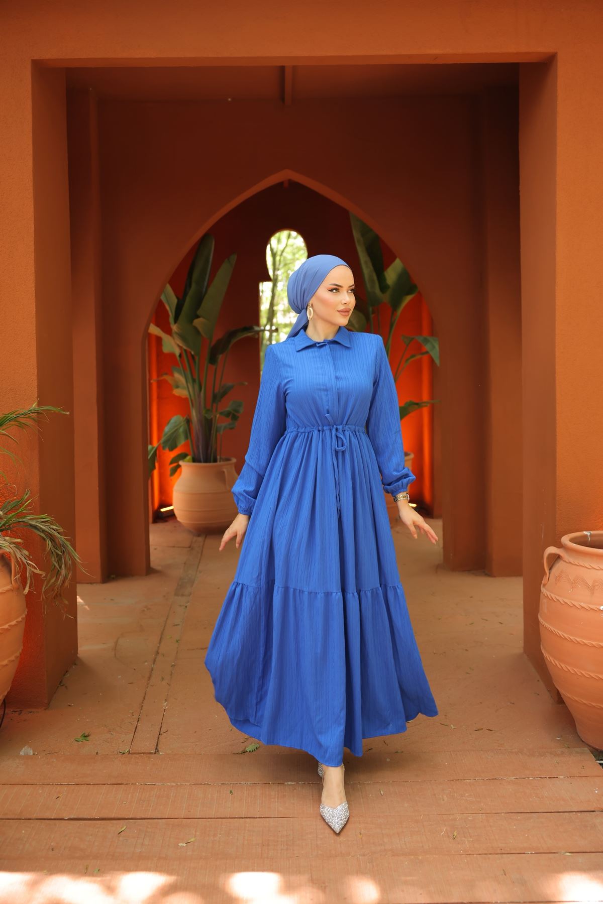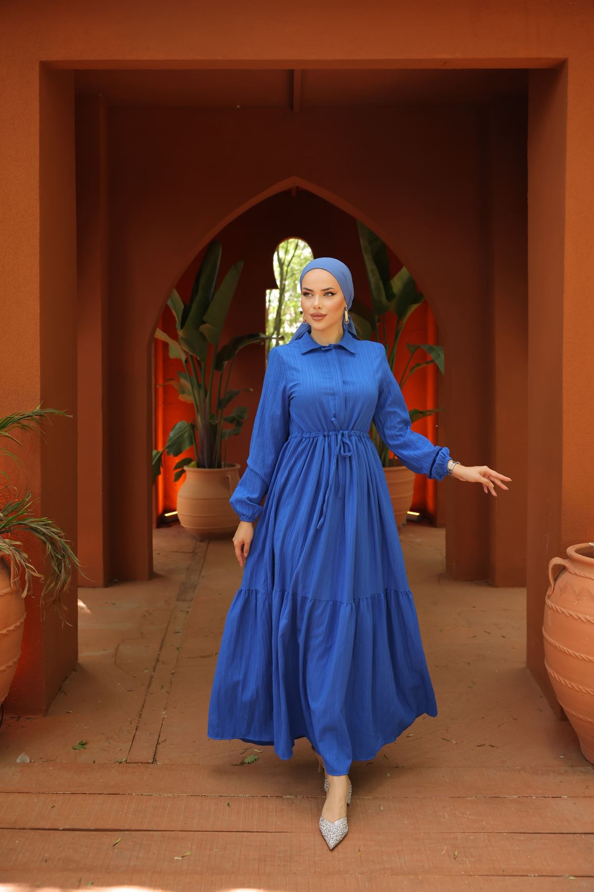 Kadın Katlı Gömlek Yaka Elbise SAKS MAVİ