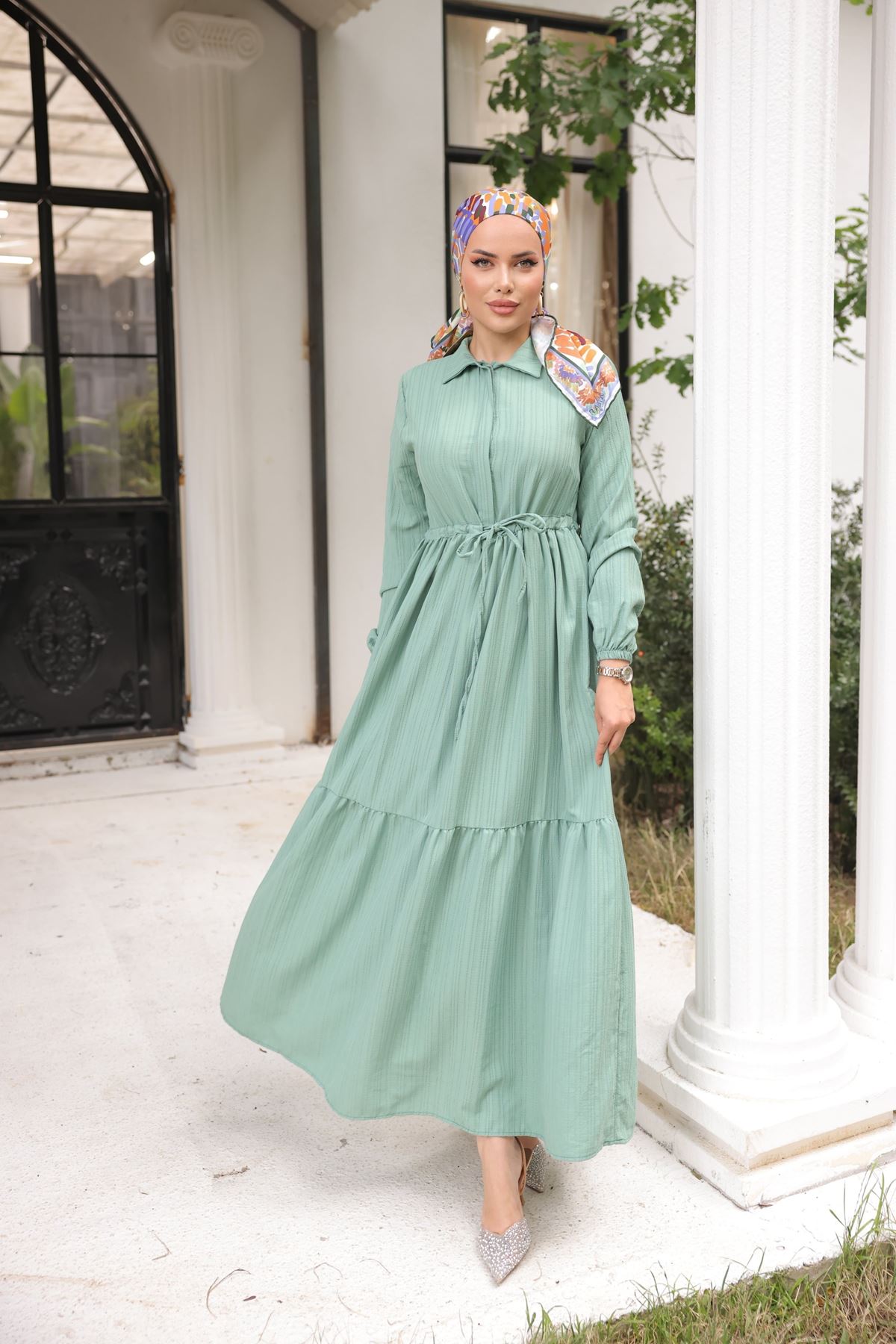 Maya Kumaş Beli Büzgülü Elbise SU YEŞİLİ