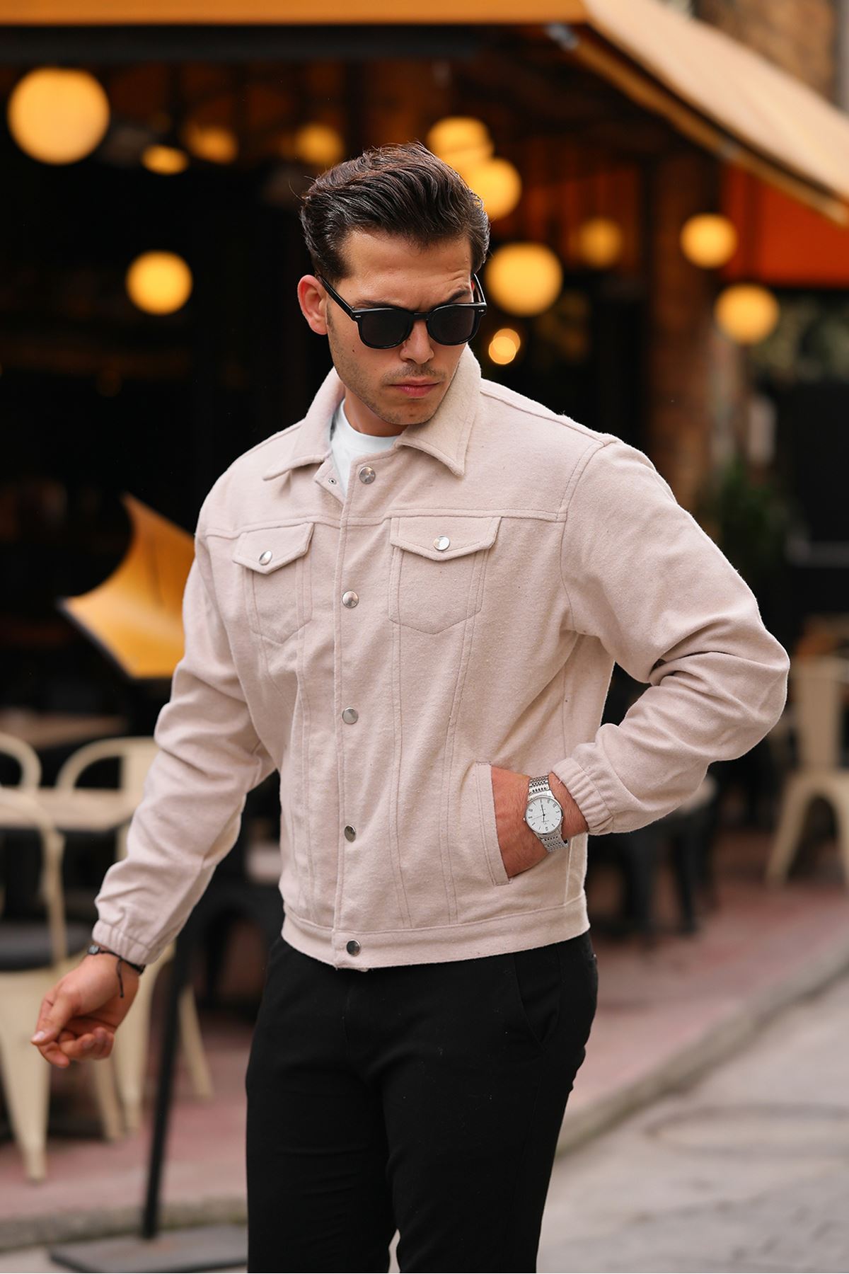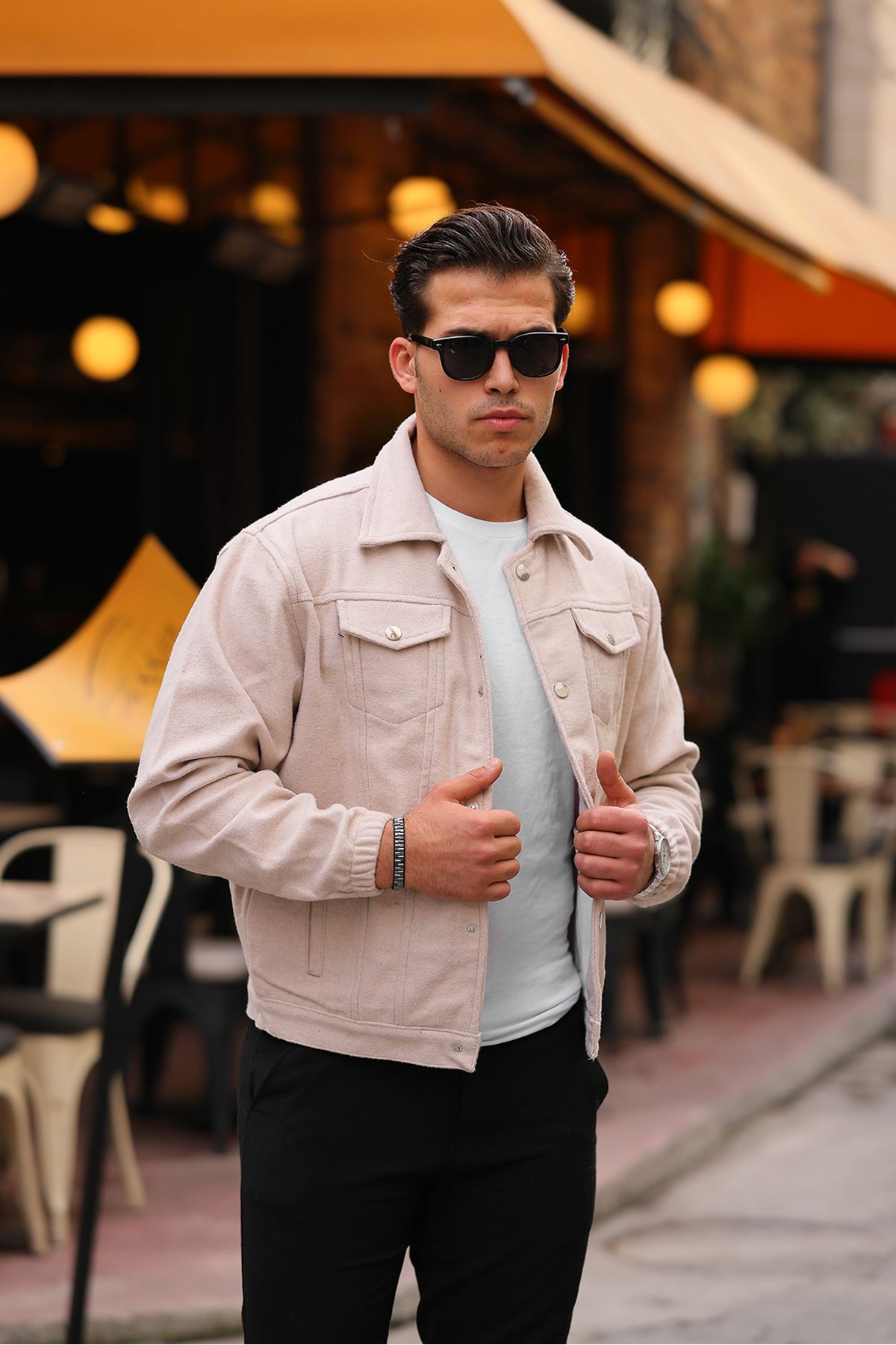 Erkek A Kalite Slim Fit Denim Kot Ceket KREM