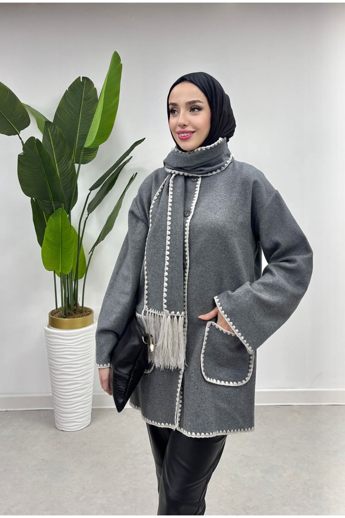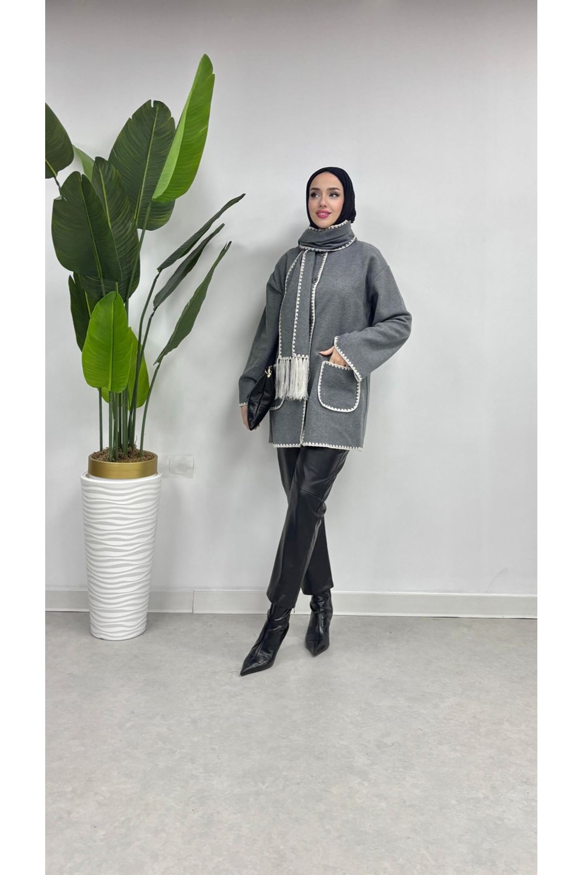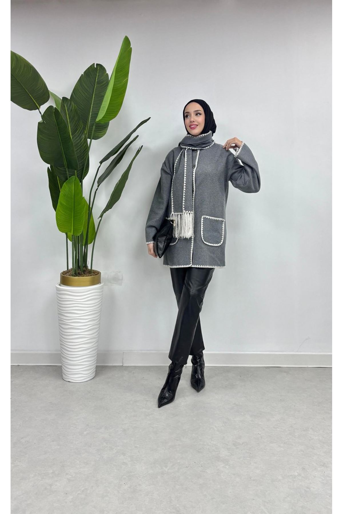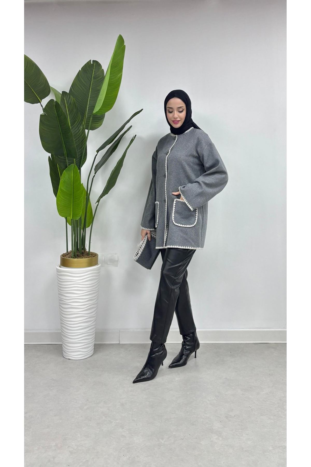 Şal Yaka Biyeli Kaşe Hırka GRİ
