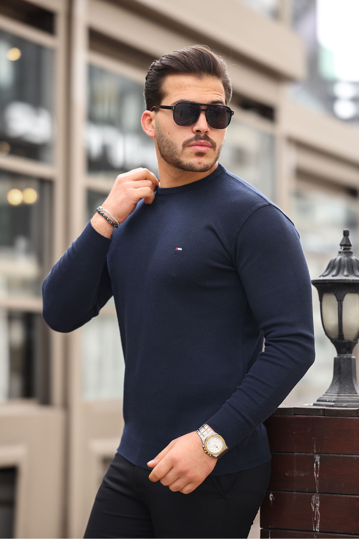 Erkek Premium Comfort Basic Mavi Uzun Kazak