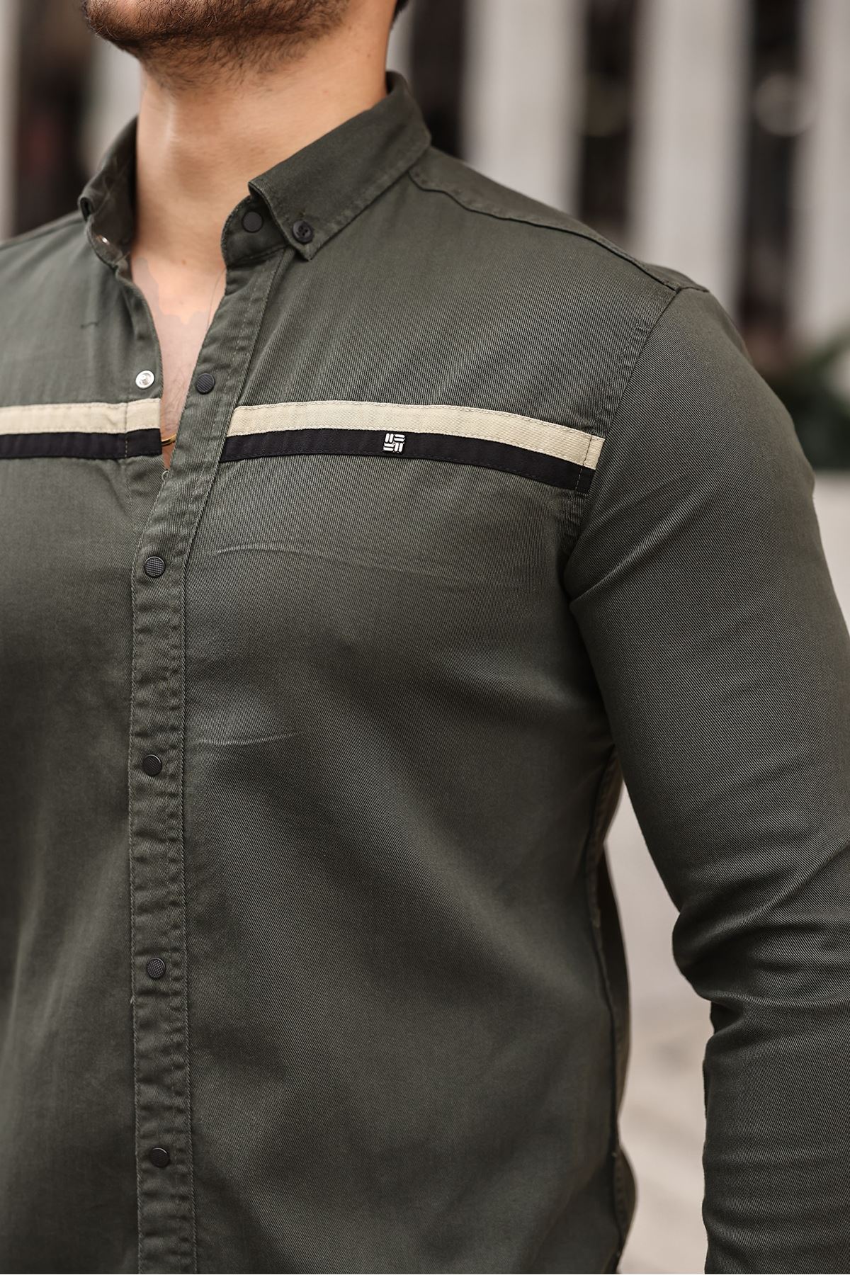 Slim Fit Ön Şerit Detaylı Çıtçıtlı Kot Gömlek HAKİ