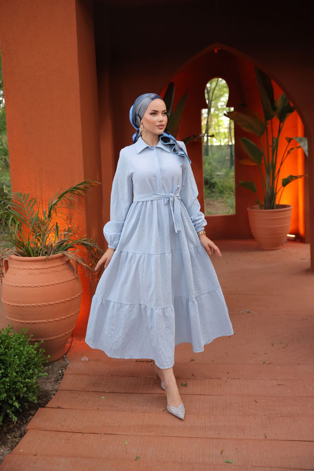 Kadın Katlı Gömlek Yaka Elbise ZÜMRÜT