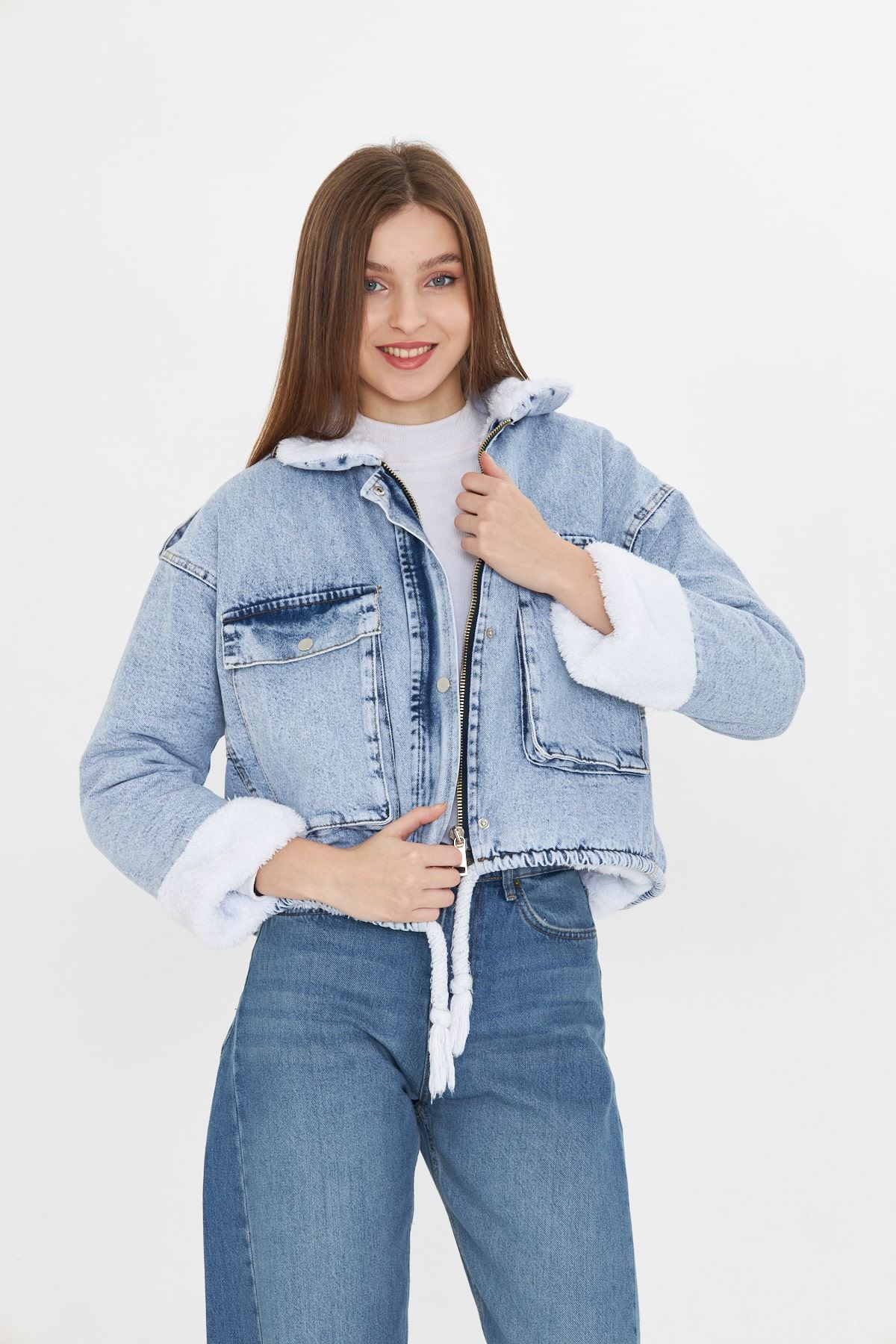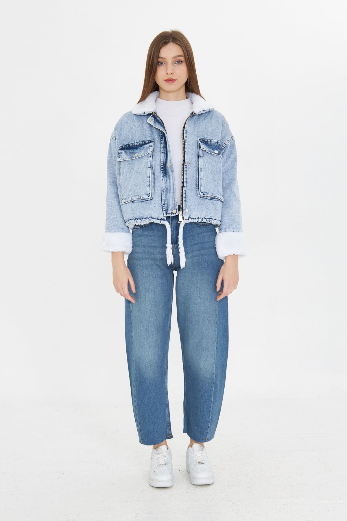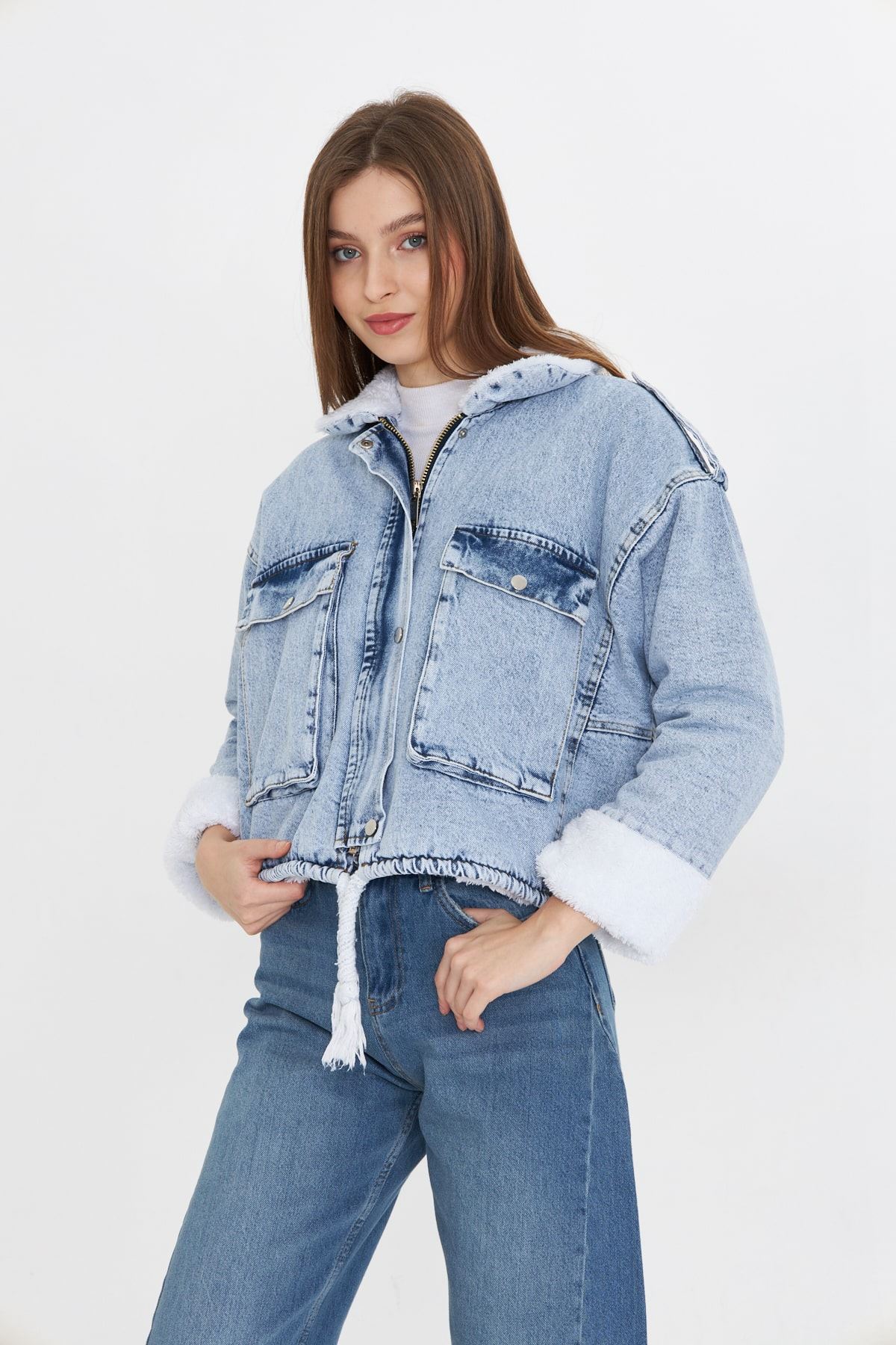 Yakası Kolları Ve Içi Yumuşak Peluş Kürklü Kot Mont BUZ MAVİ